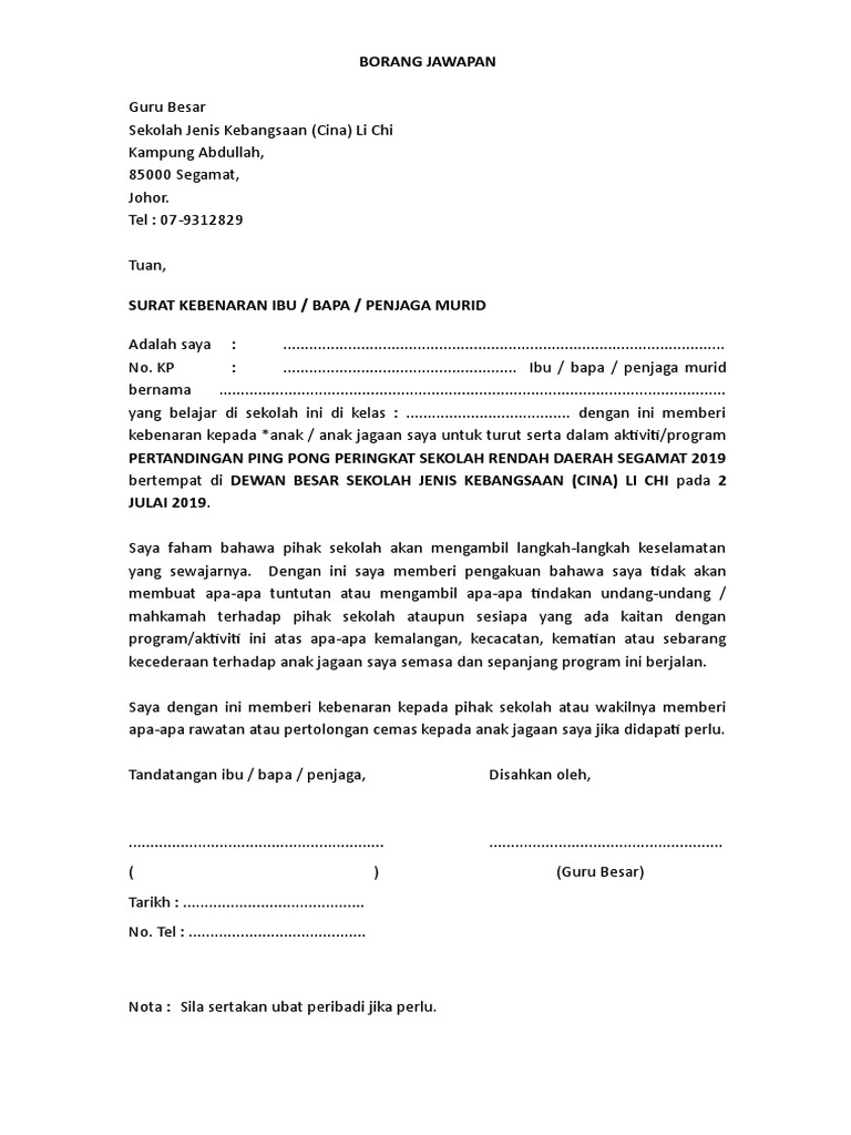 Contoh Surat Kebenaran Ibubapa Aktiviti Sukan Lawatan Dan Kokurikulum Di Sekolah Portal Cikgu